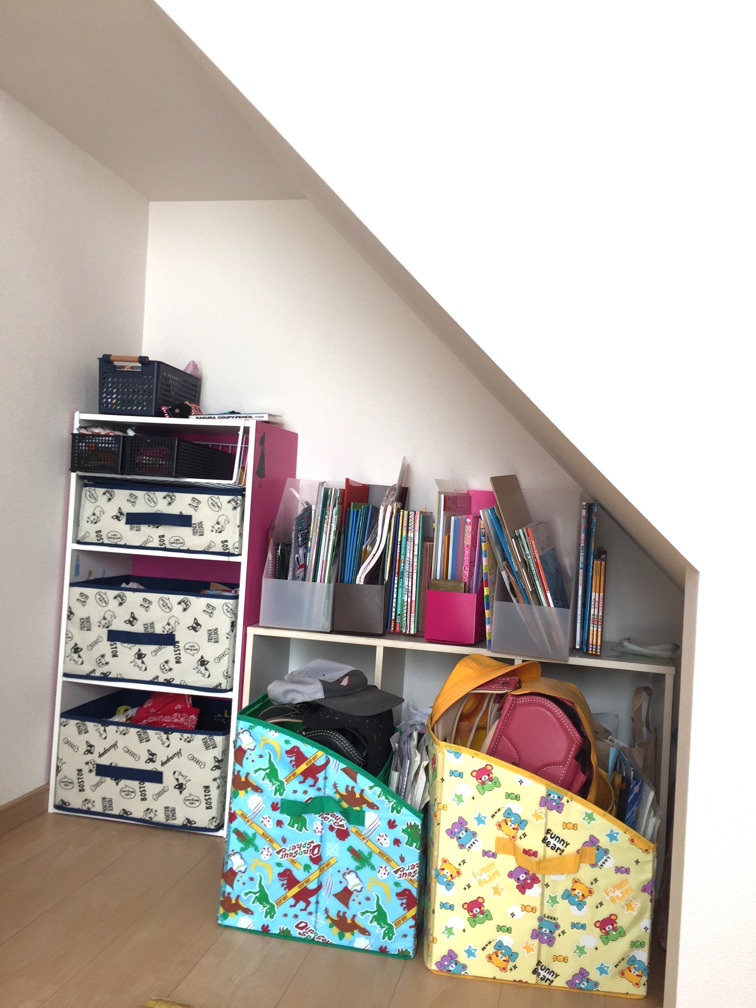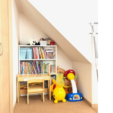 階段の傾斜をうまく利用して、本棚や通学グッズ置き場を設け、キッズコーナーとして活用されています。