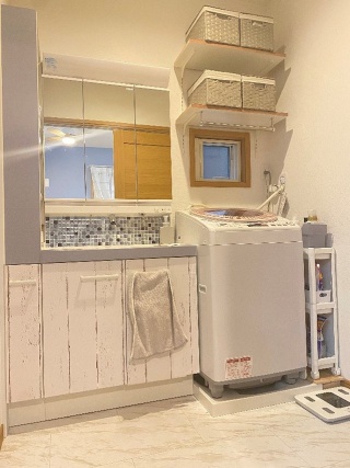 洗面室にある洗面化粧台も、鏡の下のモザイクタイルやシャビ―ウッド調のカッティングシートでアレンジされています!
