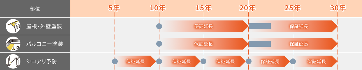 「構造体」「雨水防水」「シロアリ予防」などを保証する”最長30年長期保証”が適用されております。